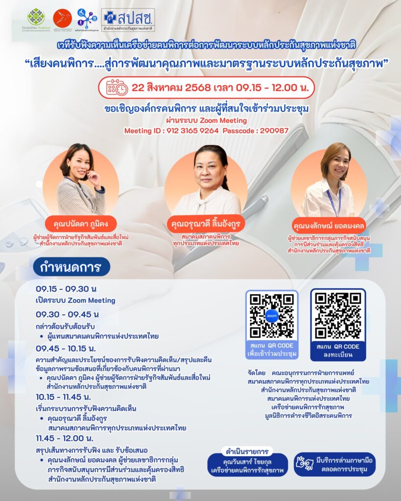 รุ่งนี้ (22 สิงหาคม 2568) ตั้งแต่เวลา 09.30 -12.00 น. ขอเชิญคนพิการ และผู้ที่สนใจเข้าร่วมประชุมออนไลน์ Zoom เวทีรับฟังความเห็นเครือข่ายคนพิการต่อการพัฒนาระบบหลักประกันสุขภาพแห่งชาติ “เสียงคนพิการ….สู่การพัฒนาคุณภาพและมาตรฐานระบบหลักประกันสุขภาพ”